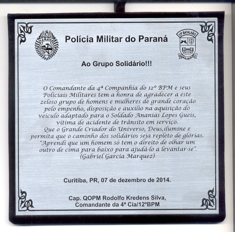 A solicitação vem assinada por 4 integrantes do Grupo Solidário e tem por objetivo viabilizar a aquisição de um veículo (usado) automático, com adaptações, para locomoção do soldado Ananias (mutilado em acidente, causado por motorista embriagado, quando estava em serviço) para que possa ser reintegrado no mercado de trabalho vez que tem capacidade e disposição para tal.