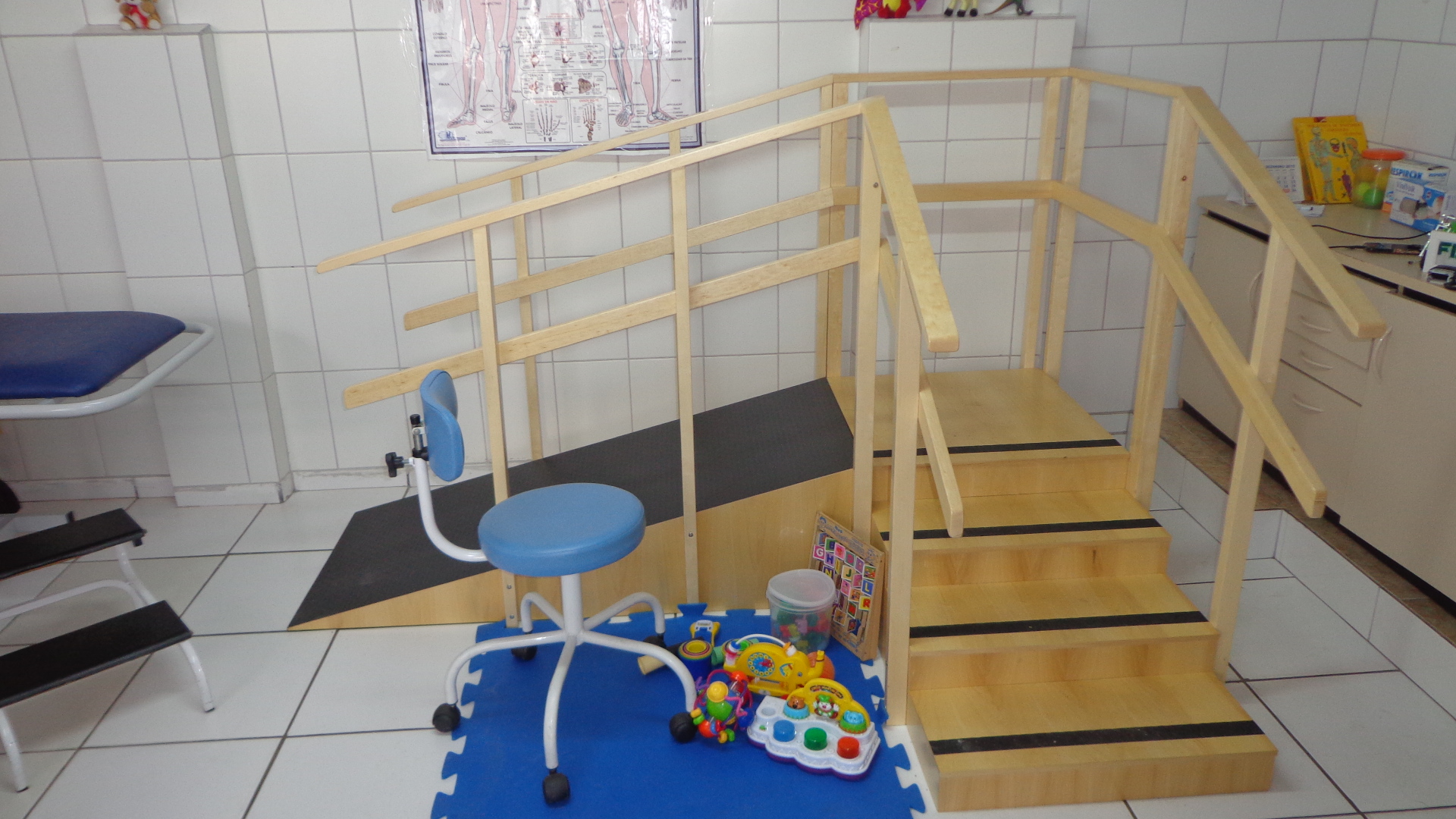 A escada é utilizada para treino de marcha (caminhada) em pacientes de todas as idades. Este equipamento possibilita ao paciente fortalecer a musculatura antigravitacional, melhorar a coordenação e a aprendizagem de deambular normalmente, fazendo com que este desenvolva maior independência funcional.