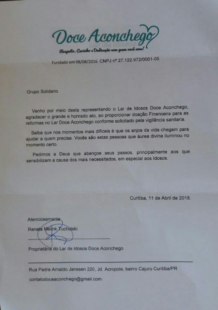 Tivemos uma lição de carinho e dedicação aos idosos/carentes que vem de mãe para filha, na pessoa da Renata que falou com muita emoção agradecendo o apoio recebido do Grupo Solidário.